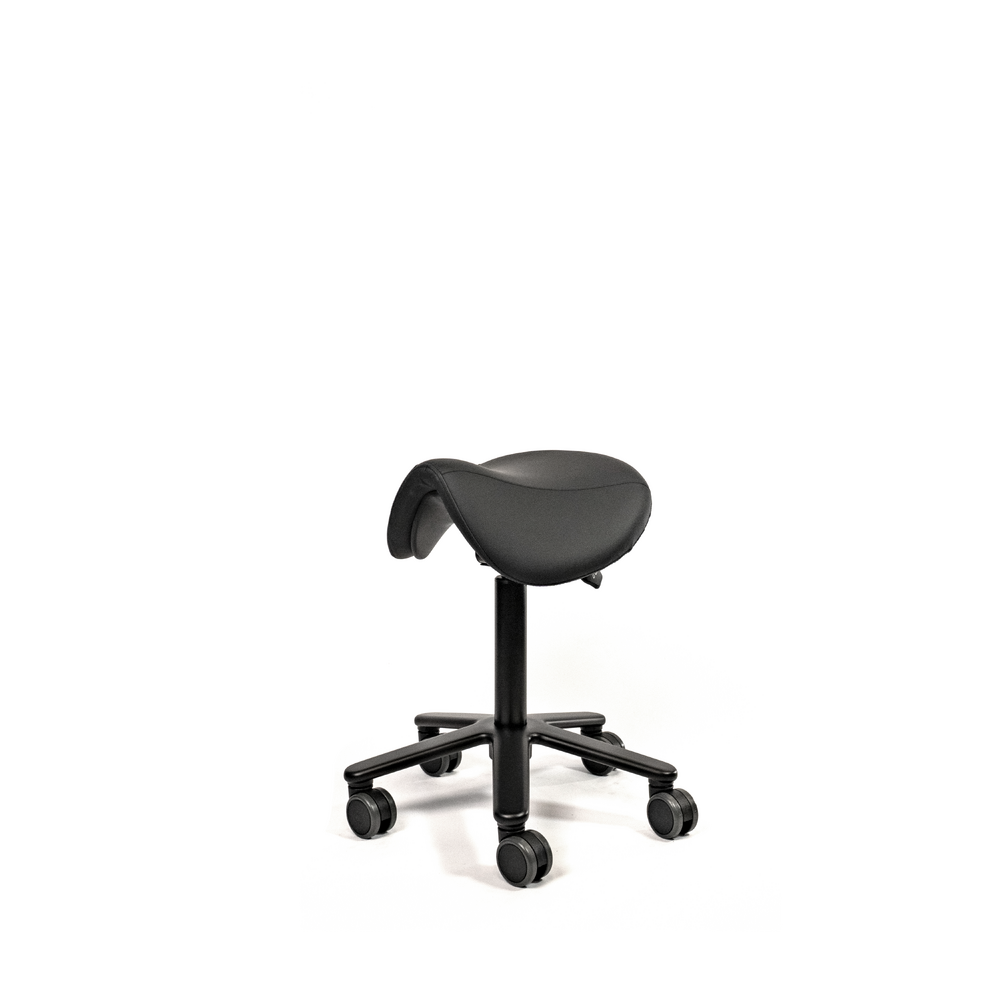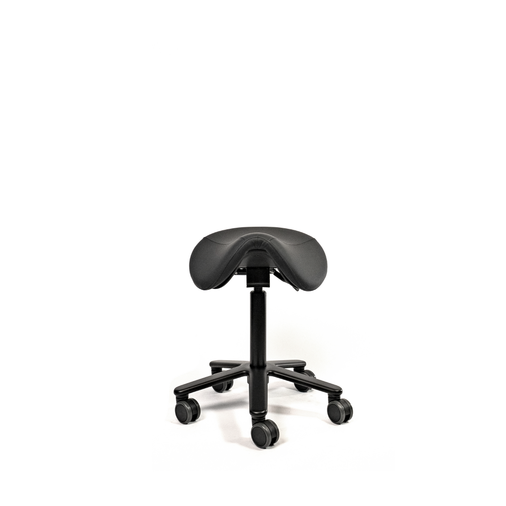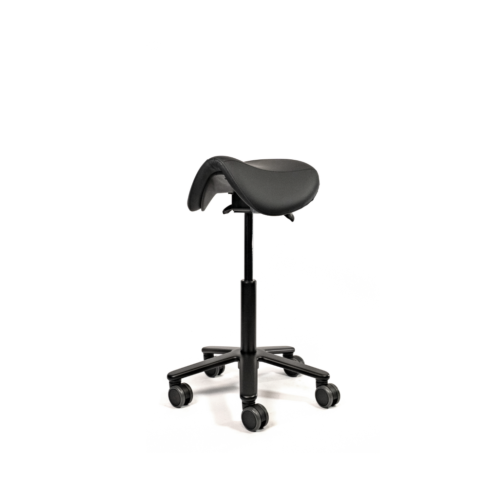 The standard molded saddle seat, is made from high quality foam covered with PU-leather. Mounted on a steel mechanism with tilt adjustment. Supported by the all black gas cylinder on a solid aluminum base with soft tread castors for all types of floors. Castors brake when no one is seated.