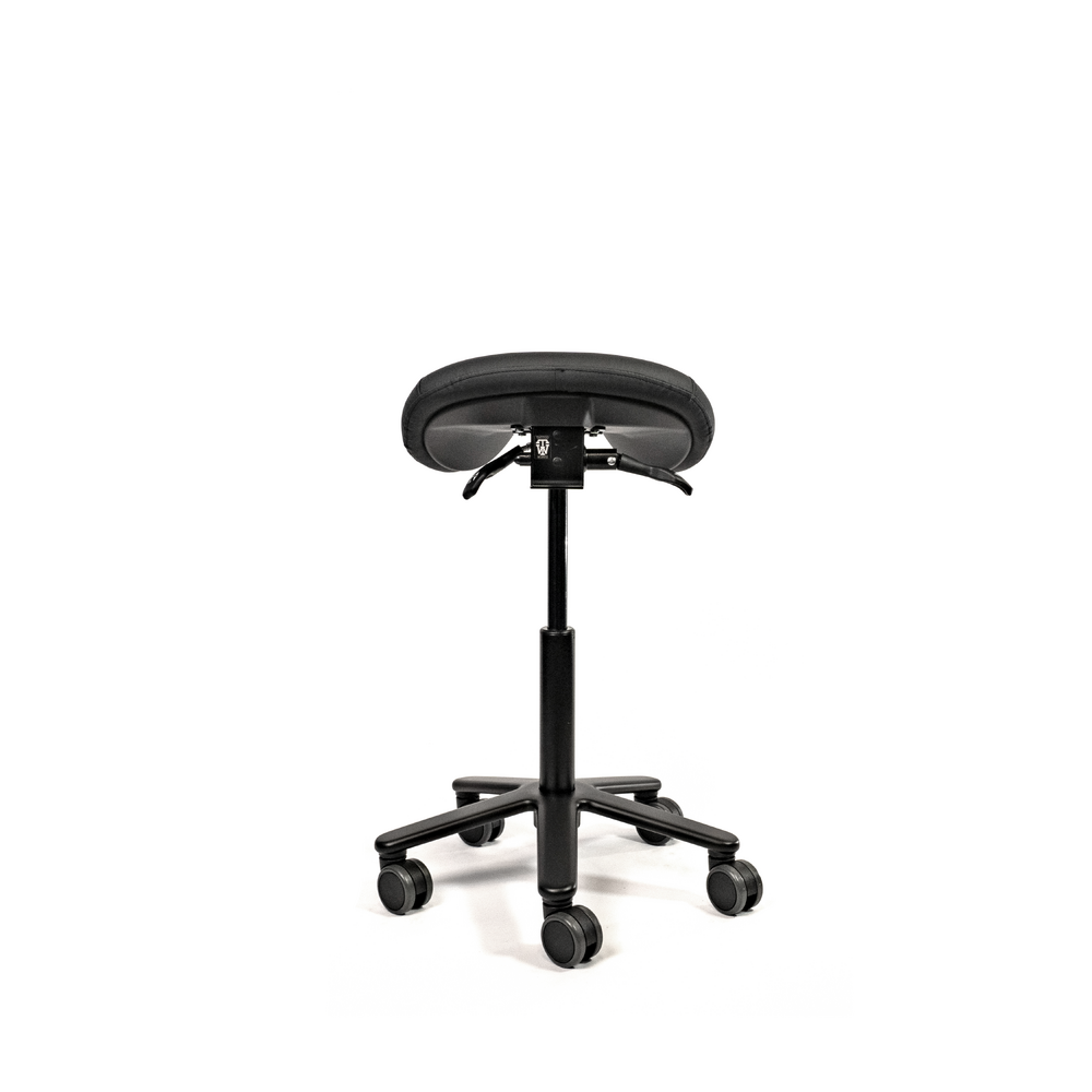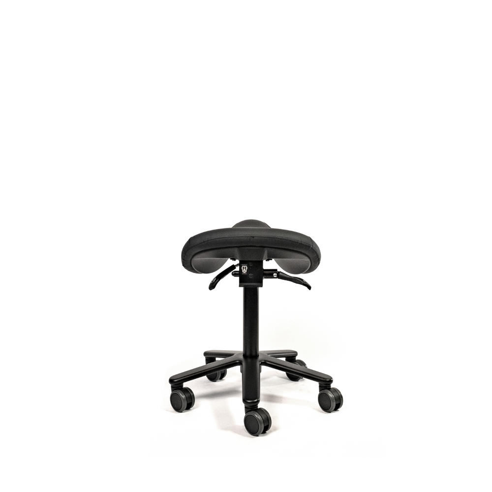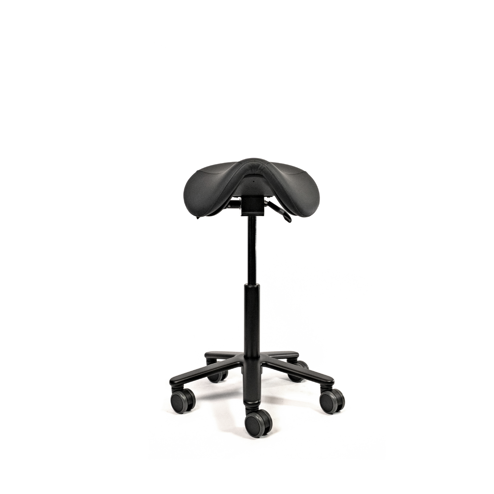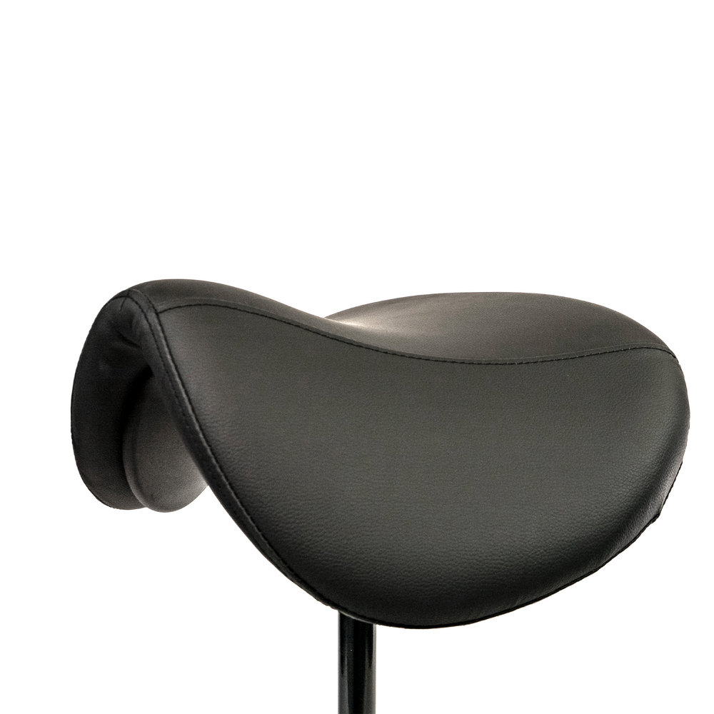 The standard molded saddle seat, is made from high quality foam covered with PU-leather. Mounted on a steel mechanism with tilt adjustment. Supported by the all black gas cylinder on a solid aluminum base with soft tread castors for all types of floors. Castors brake when no one is seated.