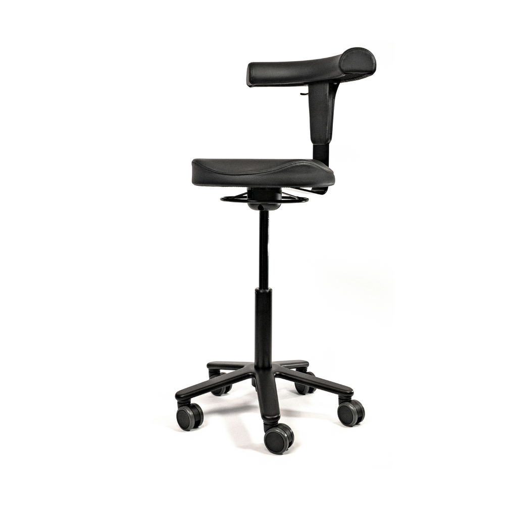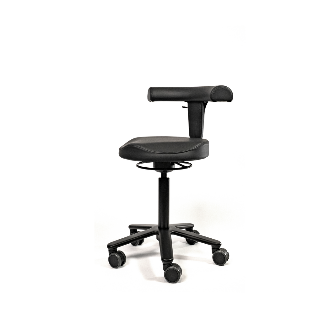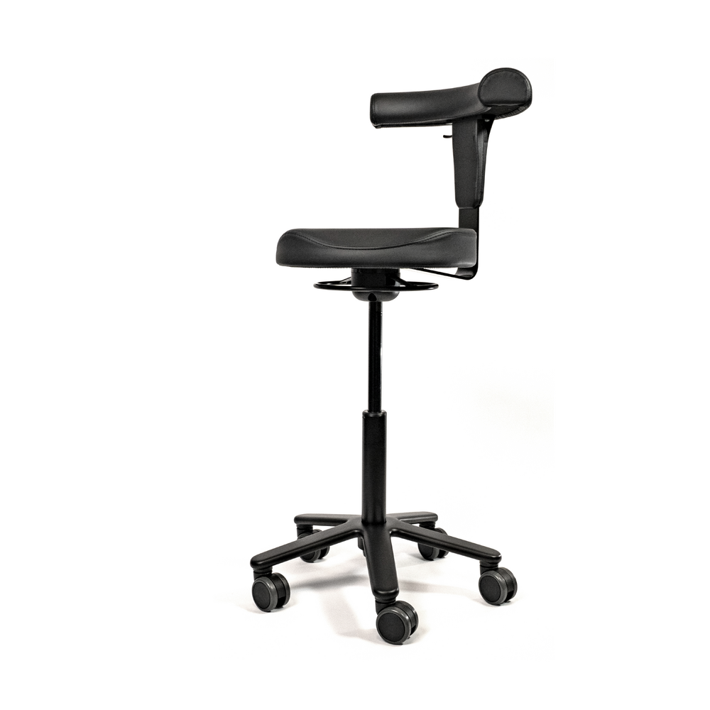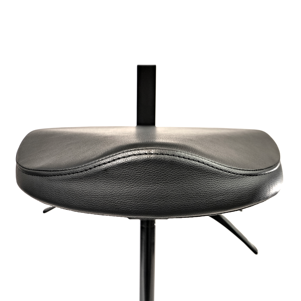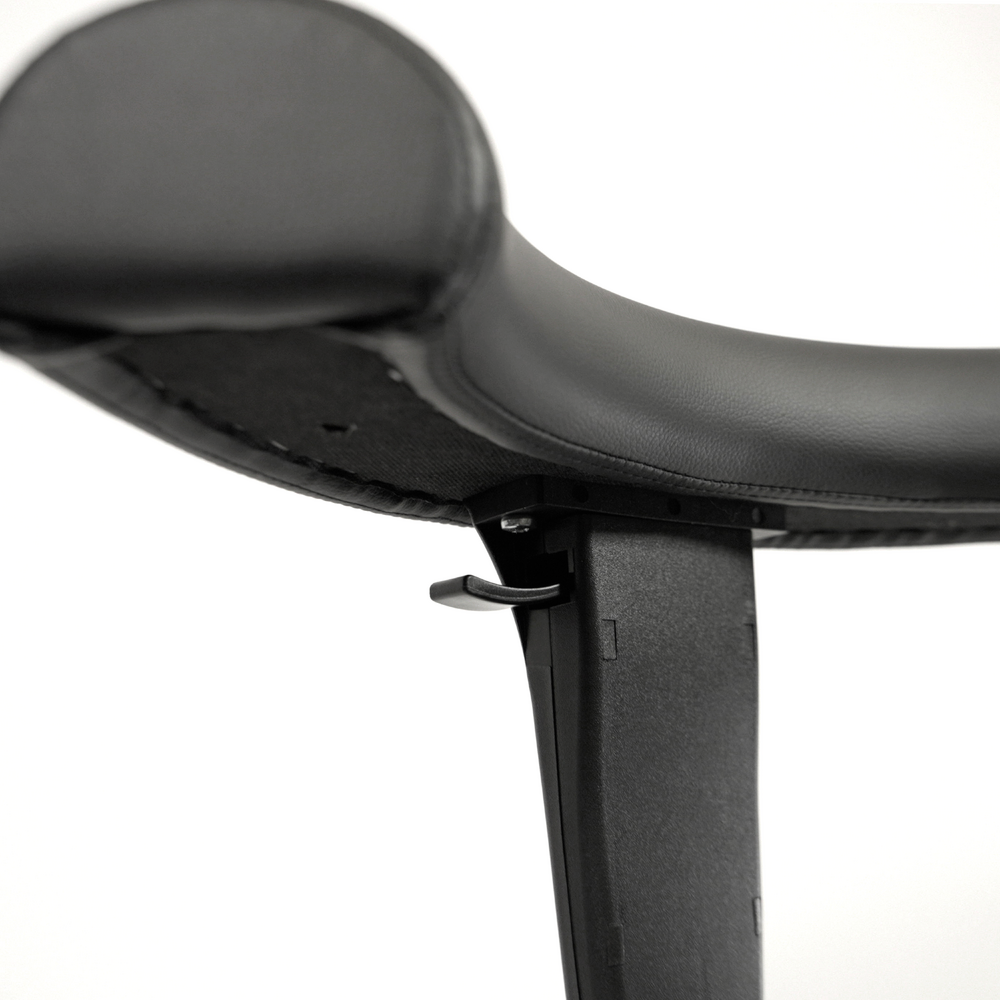 The ergonomically shaped leg recesses relieve pressure on the legs and provide excellent support. Made from high quality foam covered with PU-leather. With a hight-adjustable swivel back bar (360°) with a low installation hight. The backrest can also be used as a torso support. Mounted on a steel mechanism with fixed seat angle. Supported by the all black gas cylinder on a solid aluminum base with soft tread castors for all type of floors. Castors brake when no one is seated.