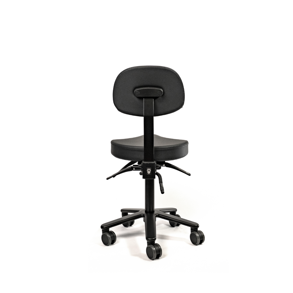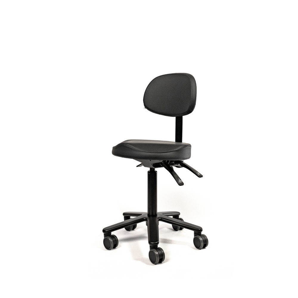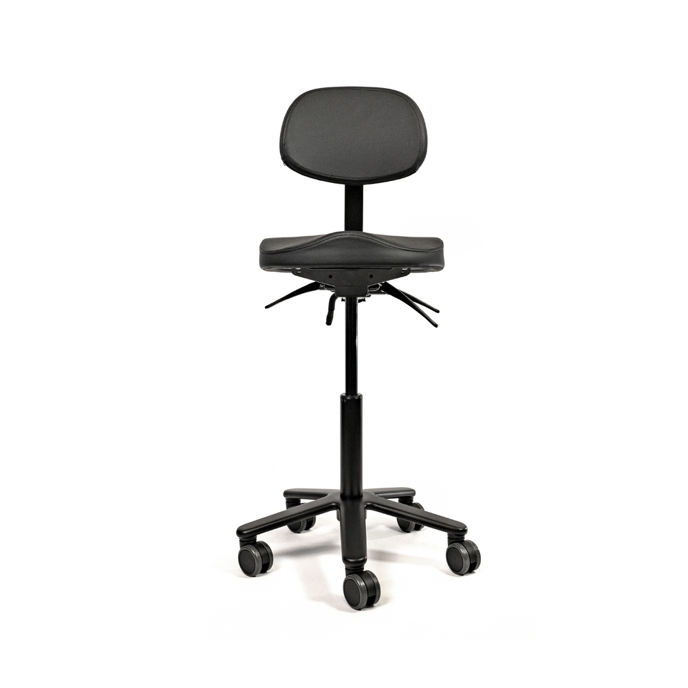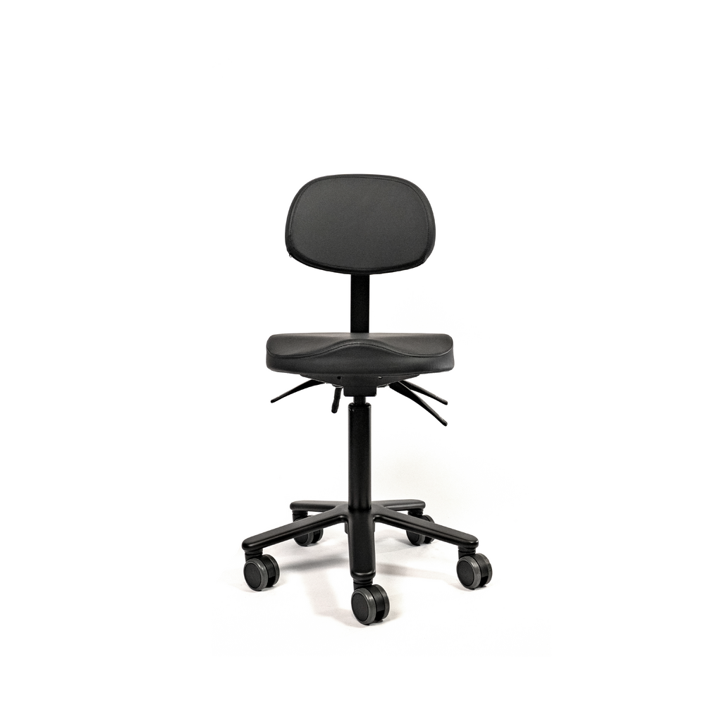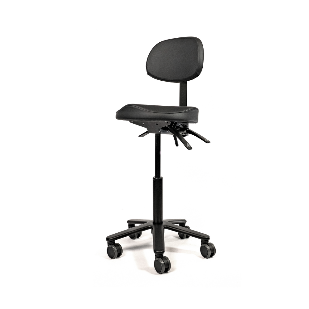 The ergonomically shaped leg recesses relieve pressure on the legs and provide excellent support. Made from high quality foam covered with PU-leather. Mounted on a steel mechanism with fixed seat angle. Supported by the all black gas cylinder on a solid aluminum base with soft tread castors for all type of floors. Castors brake when no one is seated.