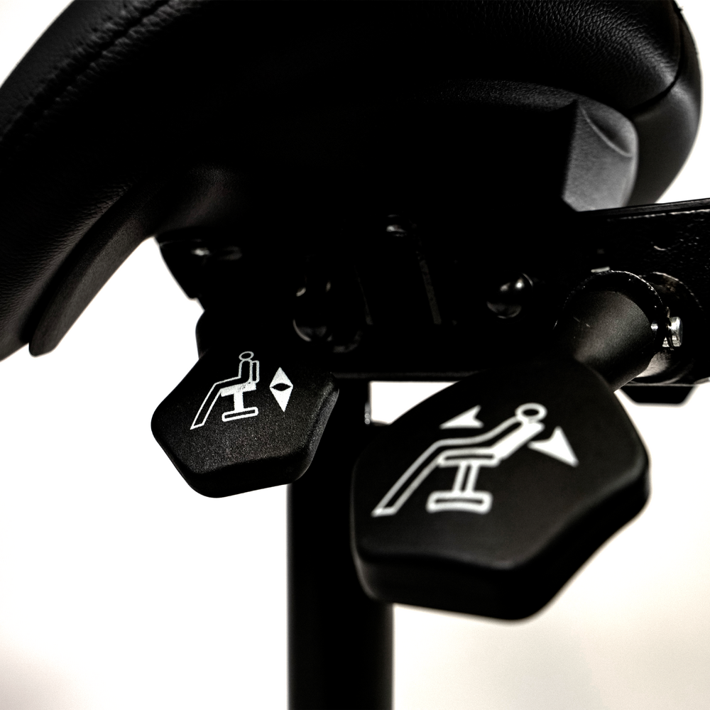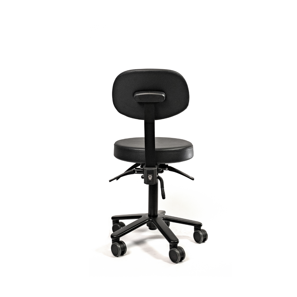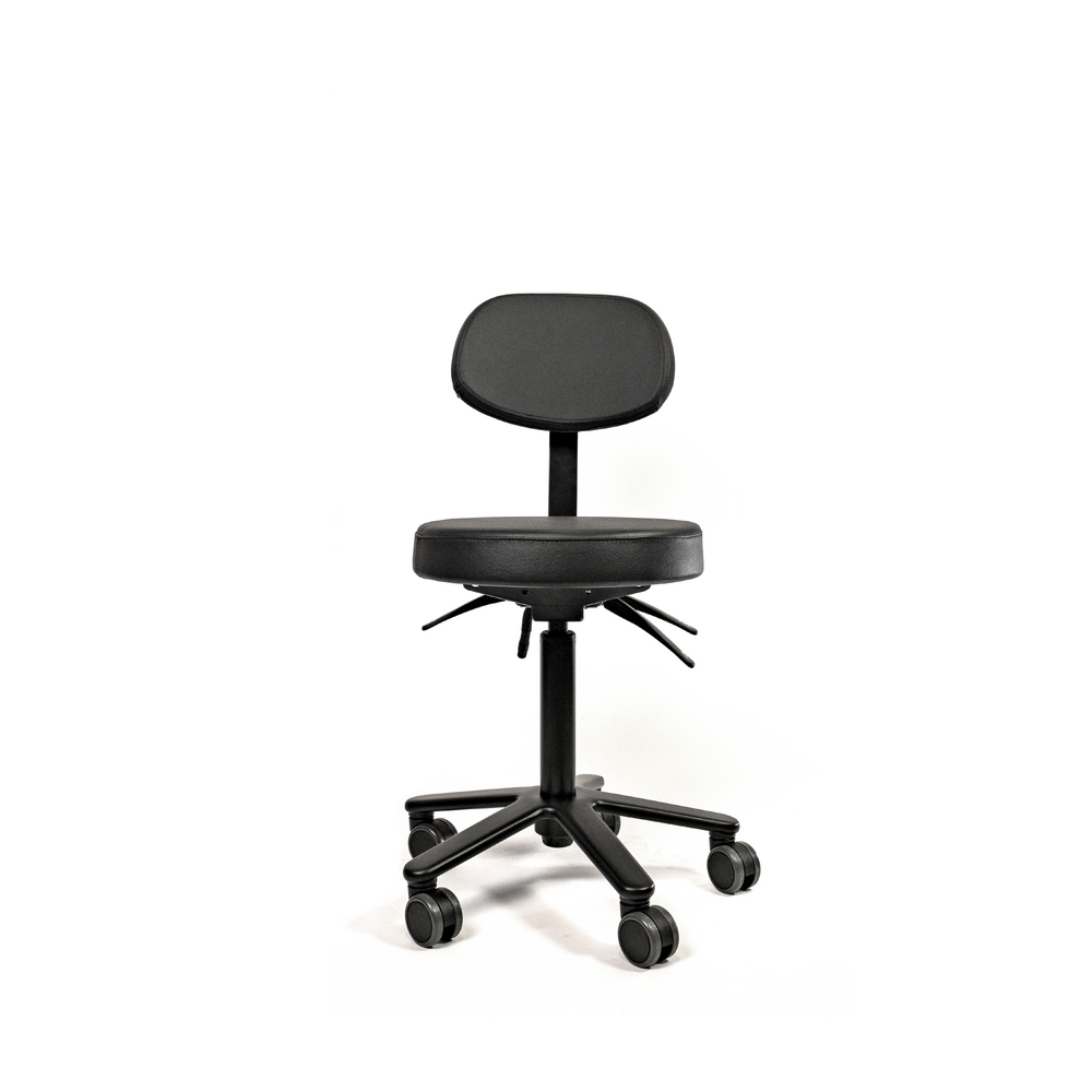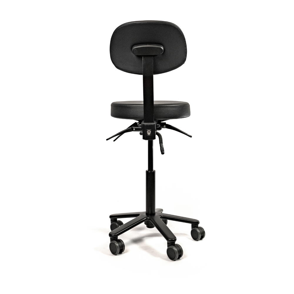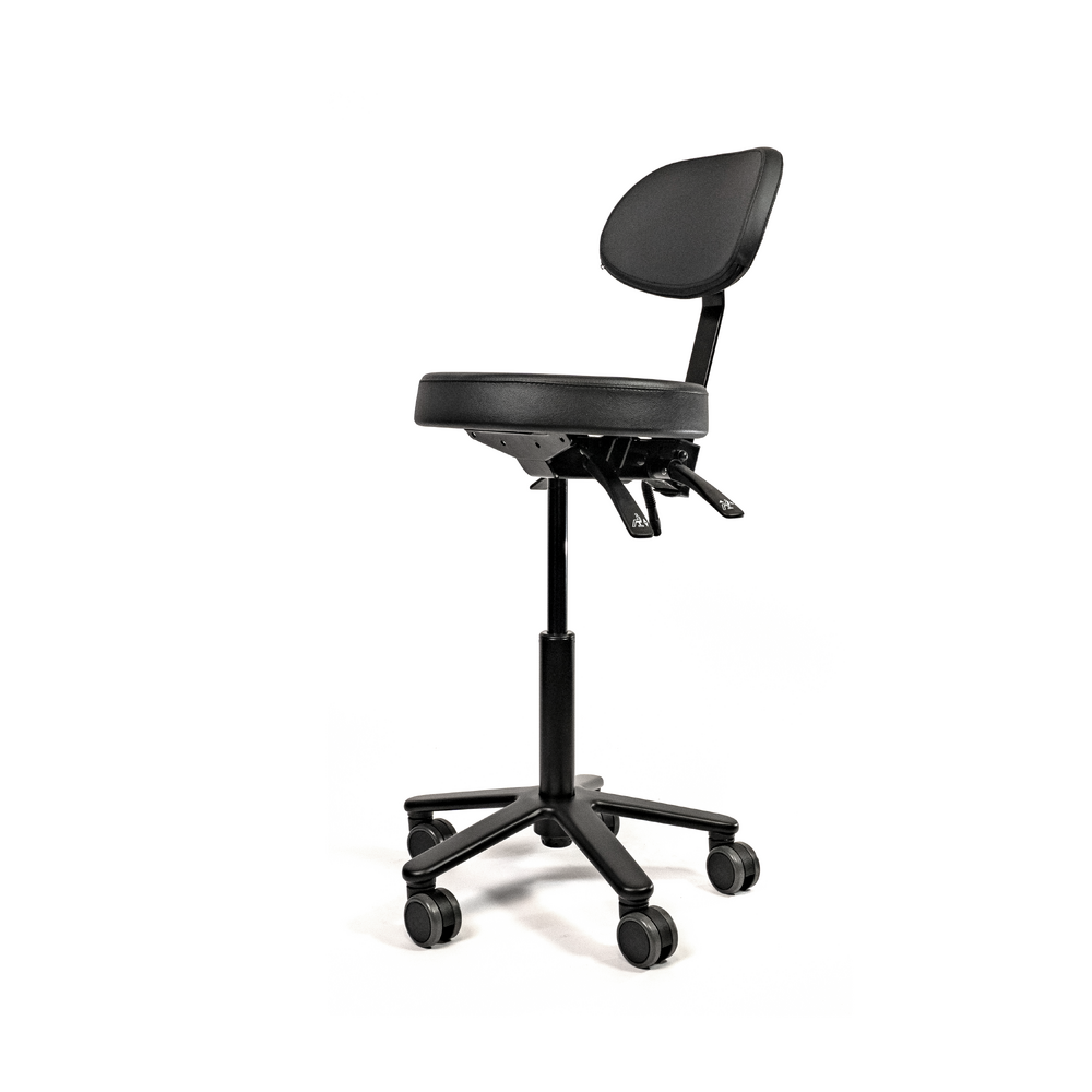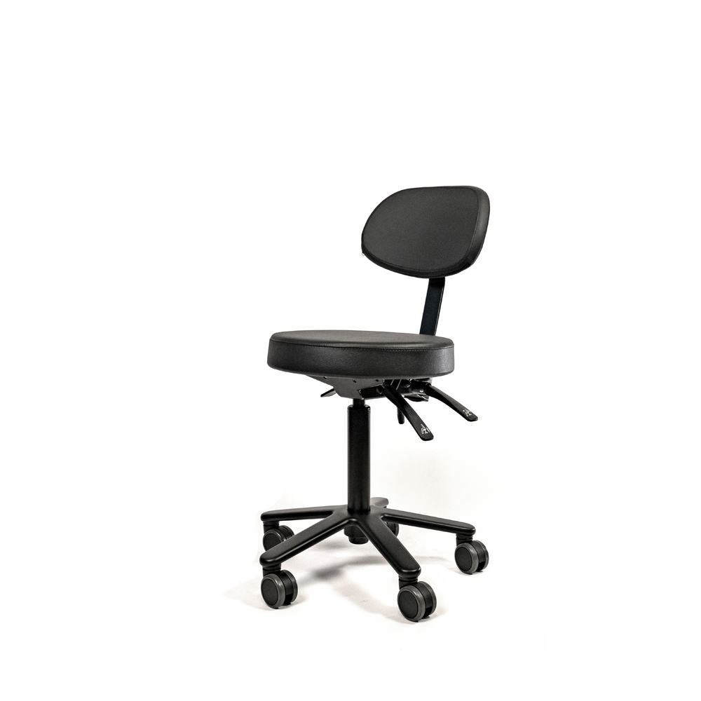 The Basic round shaped seat where a stool and saddle come together, is made from high quality foam covered with PU-leather. Mounted on a steel mechanism with fixed seat angle. Supported by the all black gas cylinder on a solid aluminum base with soft tread castors for all types of floors. Castors brake when no one is seated.