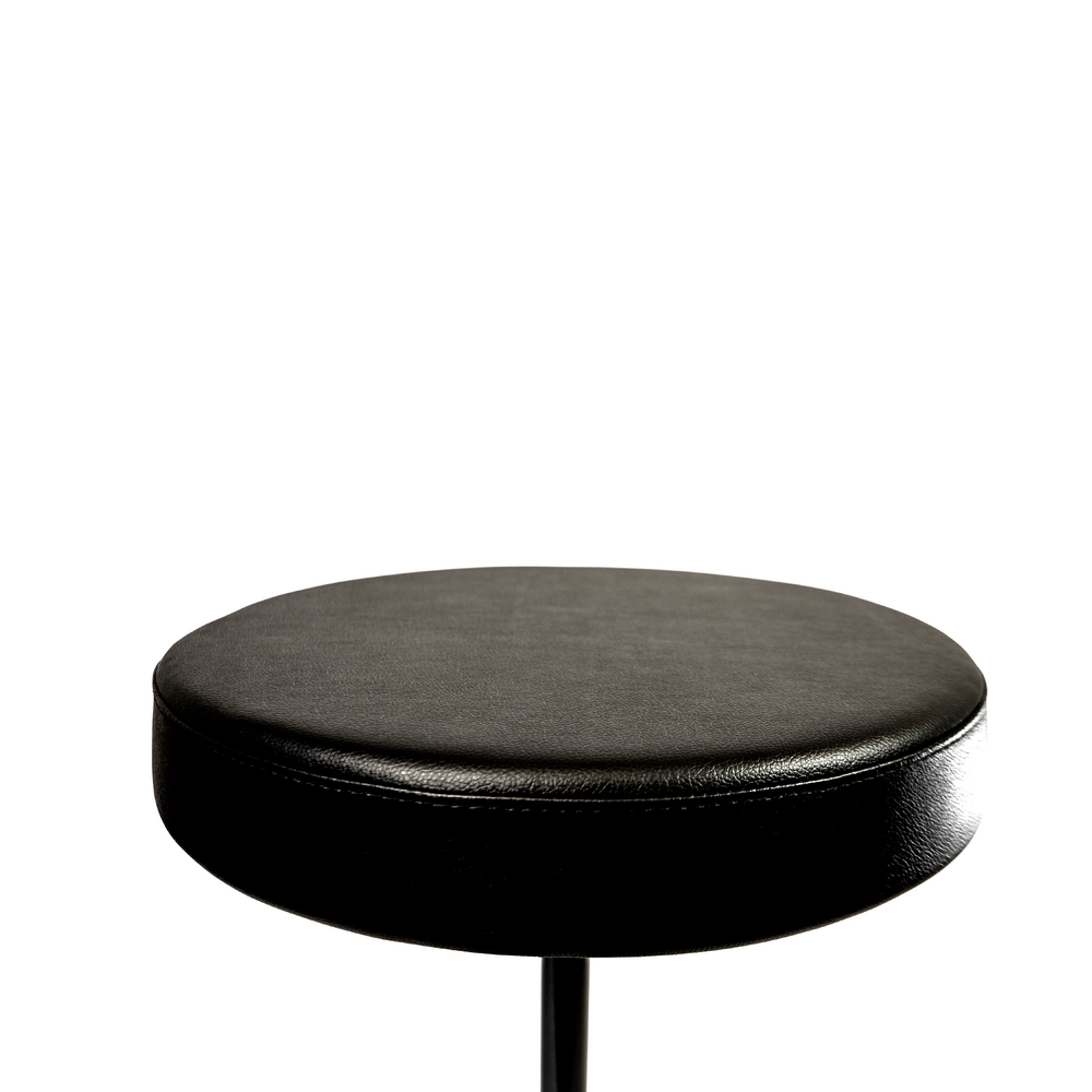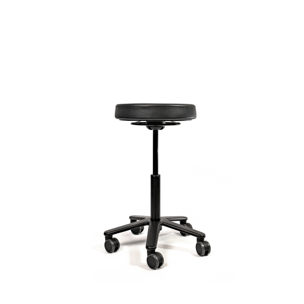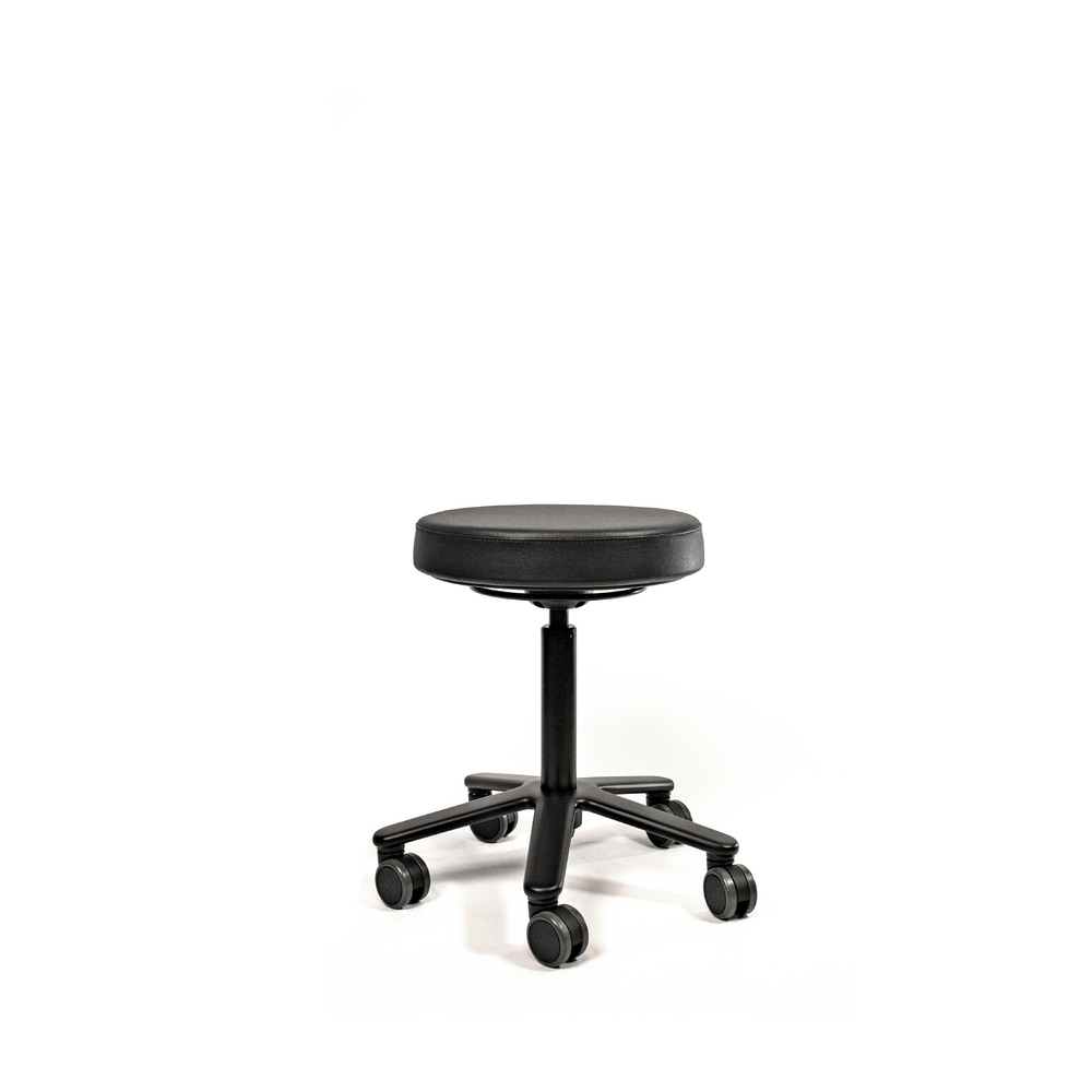 The standard round molded saddle seat, is made from high quality foam covered with PU-leather. Mounted on a steel mechanism with tilt adjustment. Supported by the all black gas cylinder on a solid aluminum base with soft tread castors for all types of floors. Castors brake when no one is seated.