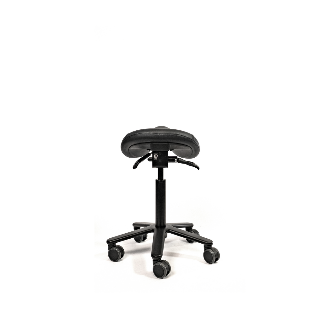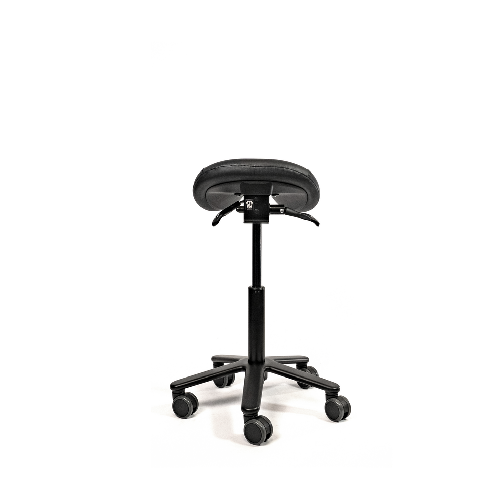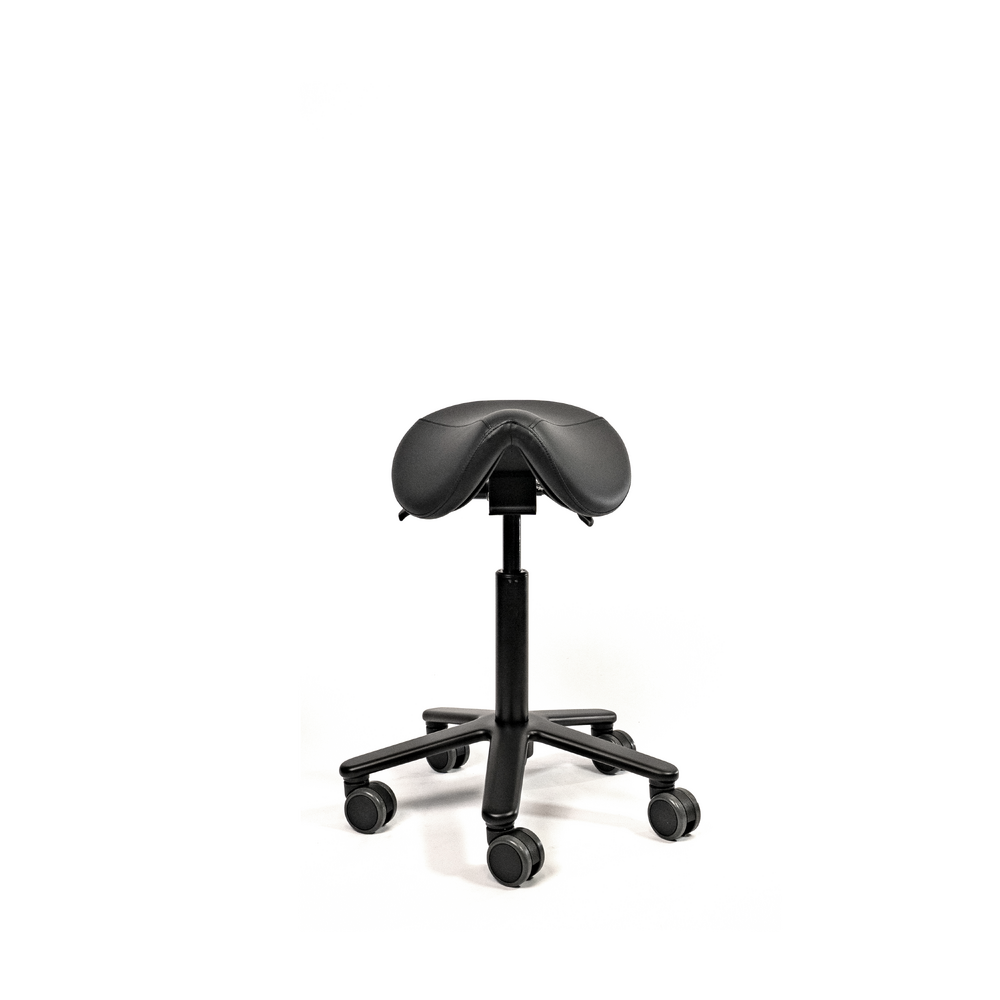 The less wide version off the molded saddle seat, is made from high quality foam covered with PU-leather. Mounted on a steel mechanism with independent back- and seat angle adjustment. Supported by the all black gas cylinder on a solid aluminum base with soft tread castors for all types of floors. Castors brake when no one is seated.