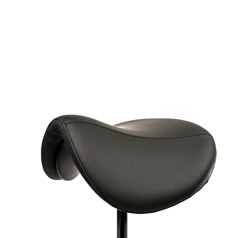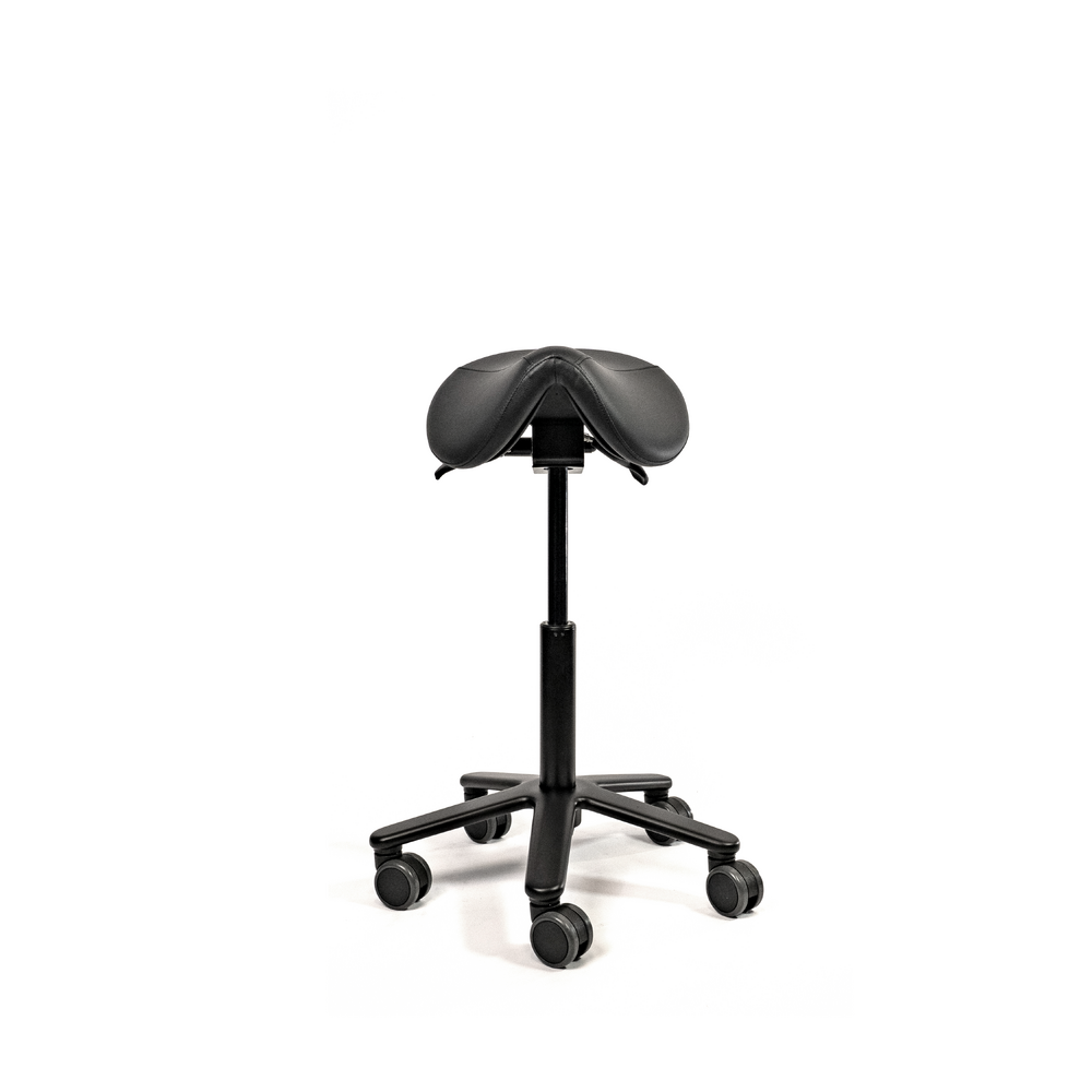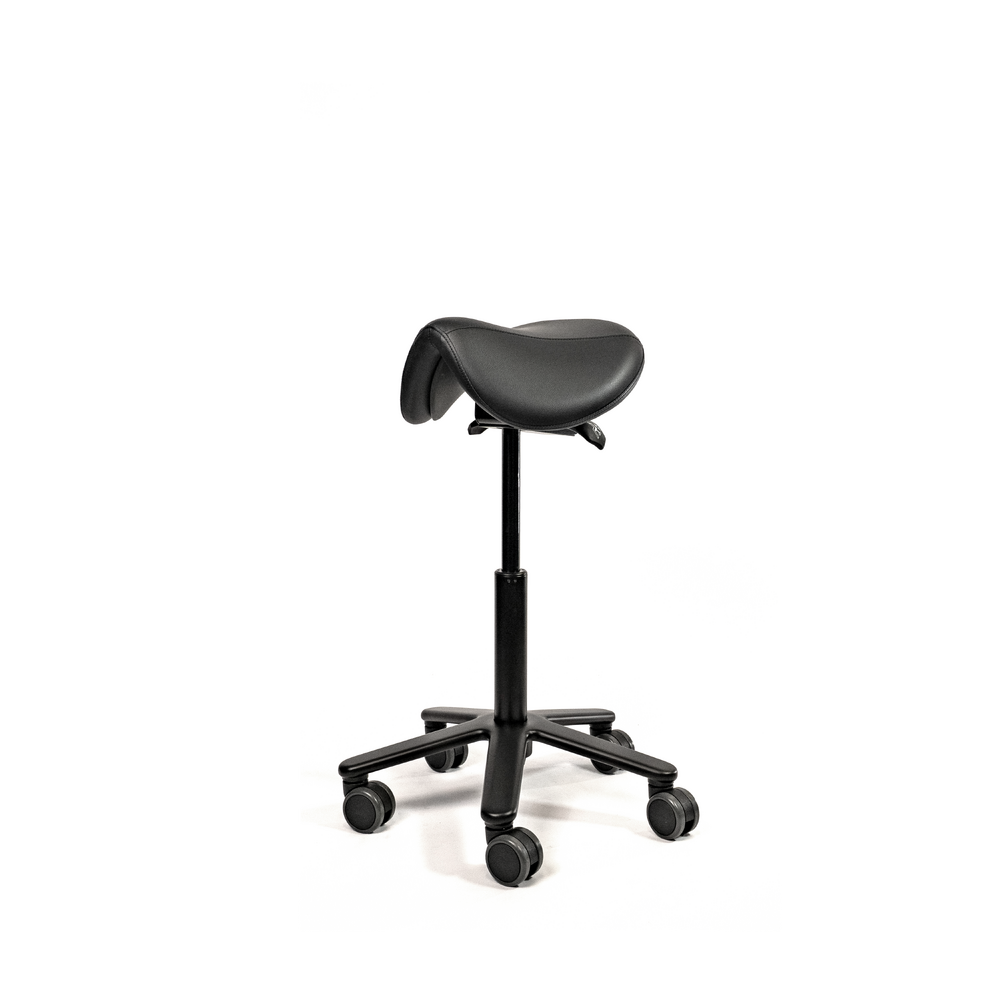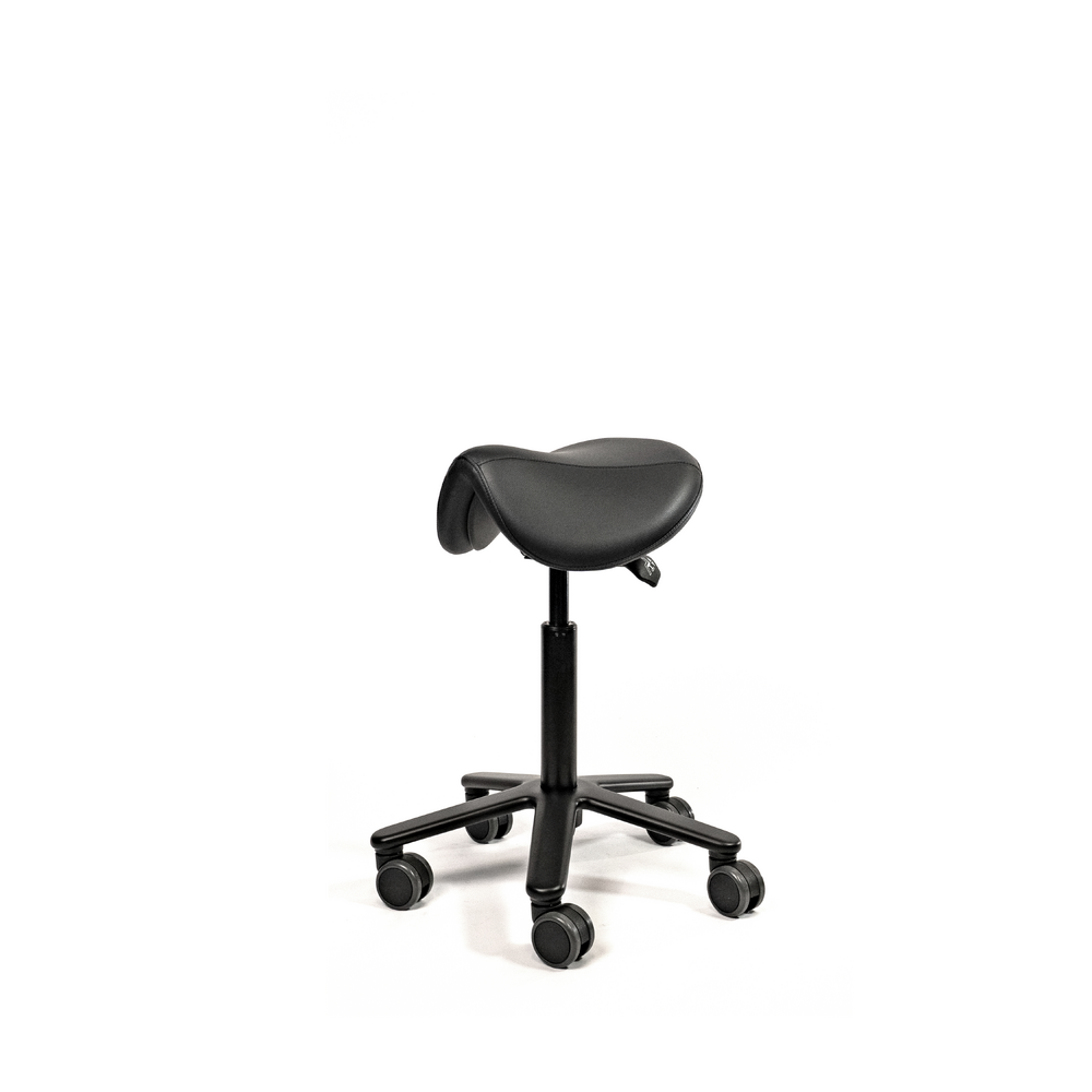 The less wide version off the molded saddle seat, is made from high quality foam covered with PU-leather. Mounted on a steel mechanism with independent back- and seat angle adjustment. Supported by the all black gas cylinder on a solid aluminum base with soft tread castors for all types of floors. Castors brake when no one is seated.